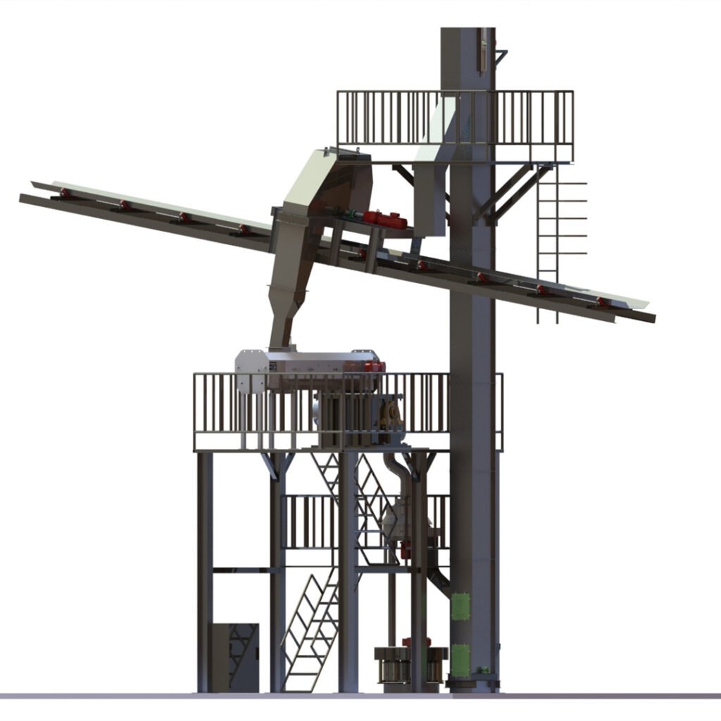 The first sample after crushing is separated by a rotary splitter, and the excess sample is returned to the conveyor line by a bucket elevator