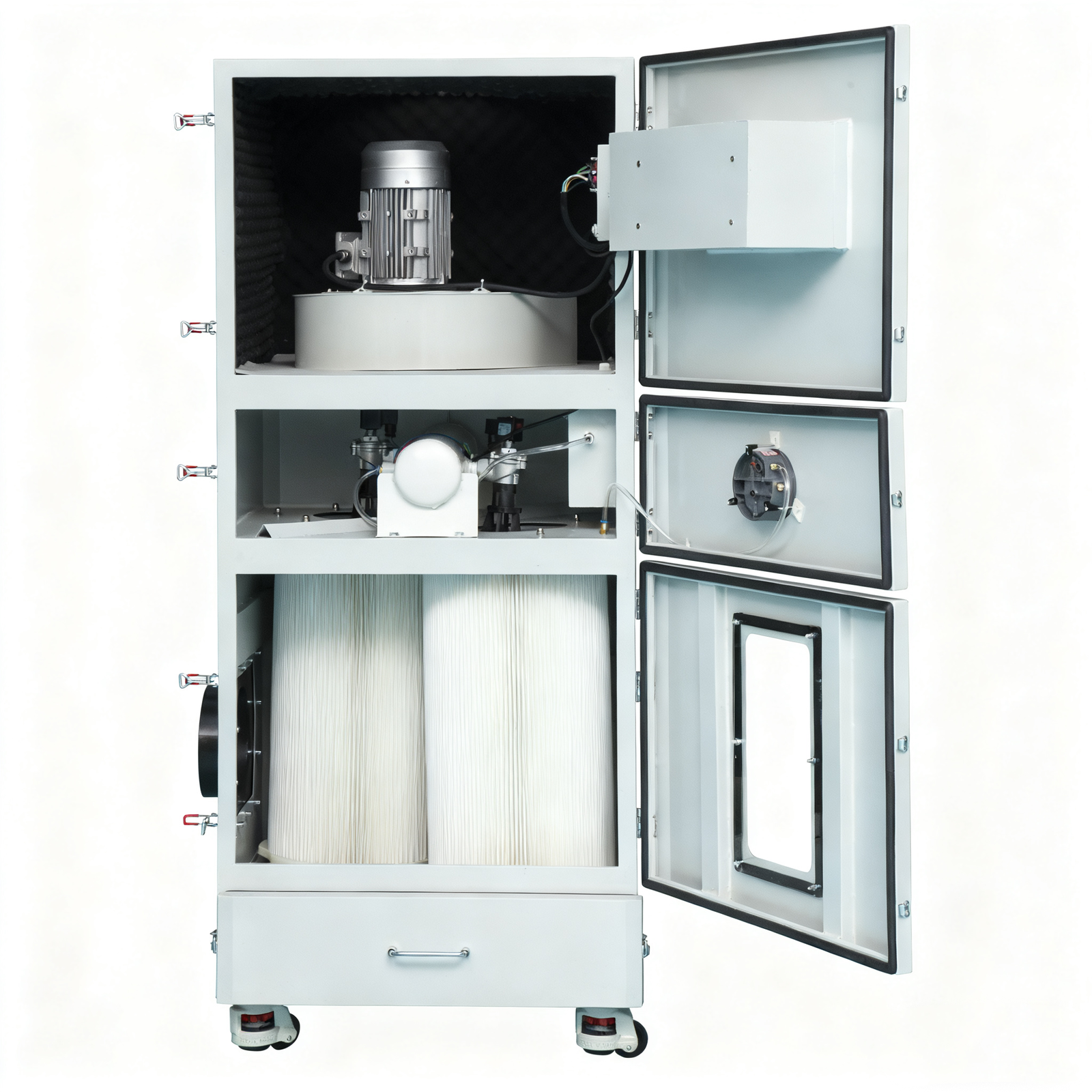 Raw material–Sheetmetal cut–Sheet bending–Sheet welding–Spray paint–Assembly–Filter cartridge–Electronic installation– Packing